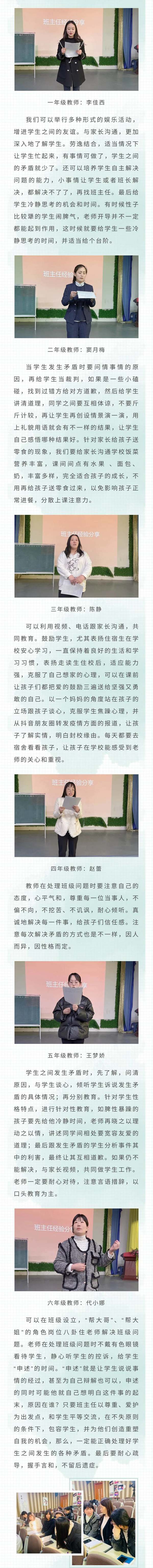 记录收获 分享感动 为进一步提高班主任的专业素养与工作能力,及时总结和推广班级管理经验,3月31日下午第一私立学校(东)政教处组织了全体班主任经验专题分享会,六名班主任结合自己的管理经验和切身感受做了交流。 本周分享主题是:“解决学生矛盾的方法与注意事项”,目的是解决学生在校时间过长,学生情绪浮躁。交流会上,班主任结合各班级实际情况进行分享。一种种独具特色的带班理念和管理风格、一个个真实、鲜活的典型案例,让全体班主任获益匪浅,引发许多感触和思考。 智慧众筹,博采众长。通过本次班主任经验分享,相信所有的班主任都受益匪浅,相信各位老师都会把此次分享好的经验运用到自己的工作实践当中去,扎实而有效的做好班级工作。在今后的工作中,第一私立学校全体班主任将不断汲取新理念、新知识,创新工作方法,聚焦专业成长,在追梦路上,携手同行,努力推动学校德育工作再上新台阶! END